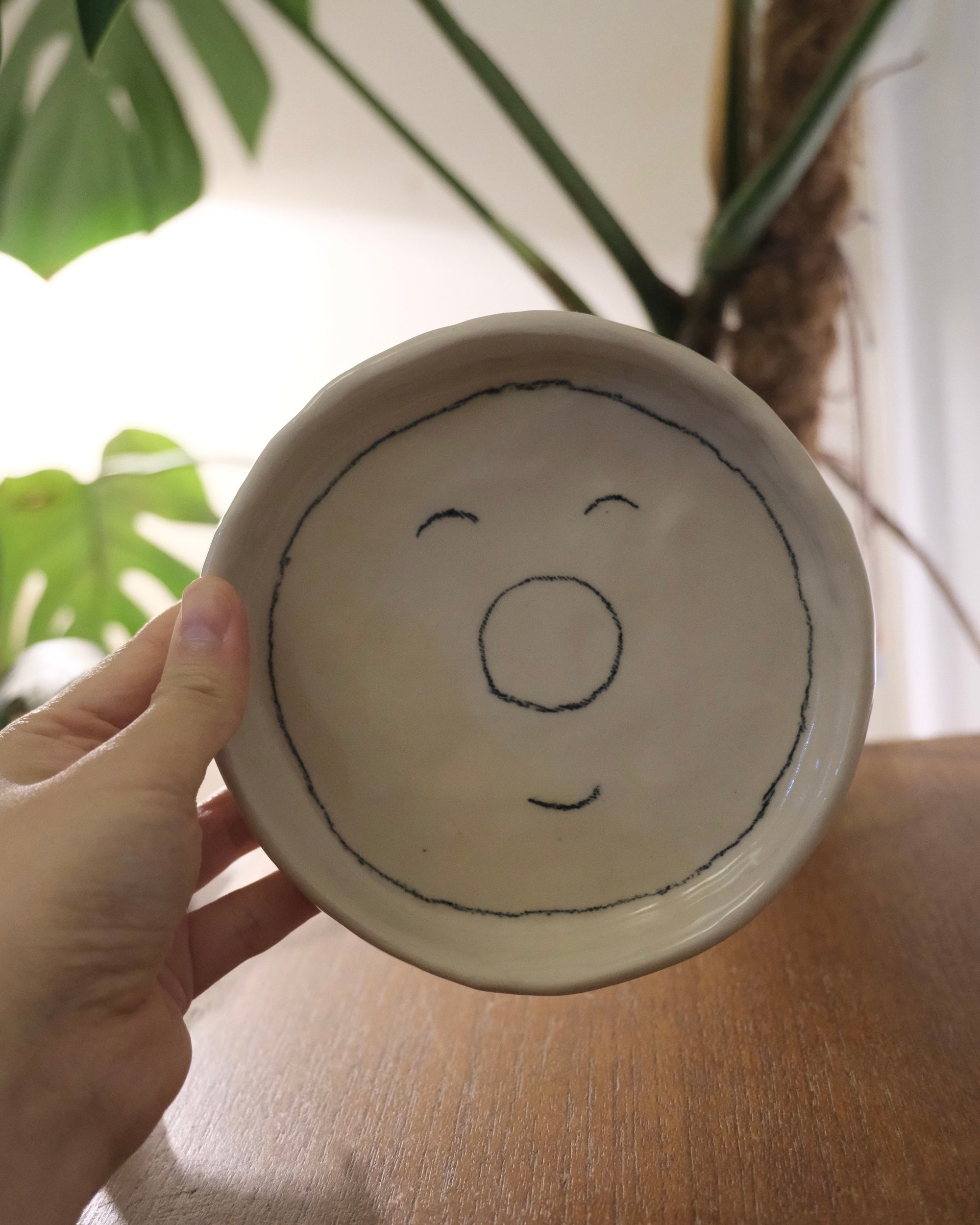 This plate is made of stoneware clay with a lead-free transparent glaze. It is decorated with underglaze and fired at a high temperature. Each piece is individually crafted using hand-building techniques. I hope this small, cute fella makes your breakfast a little happier and brings a smile to your face.