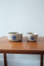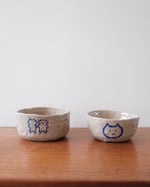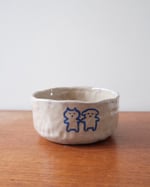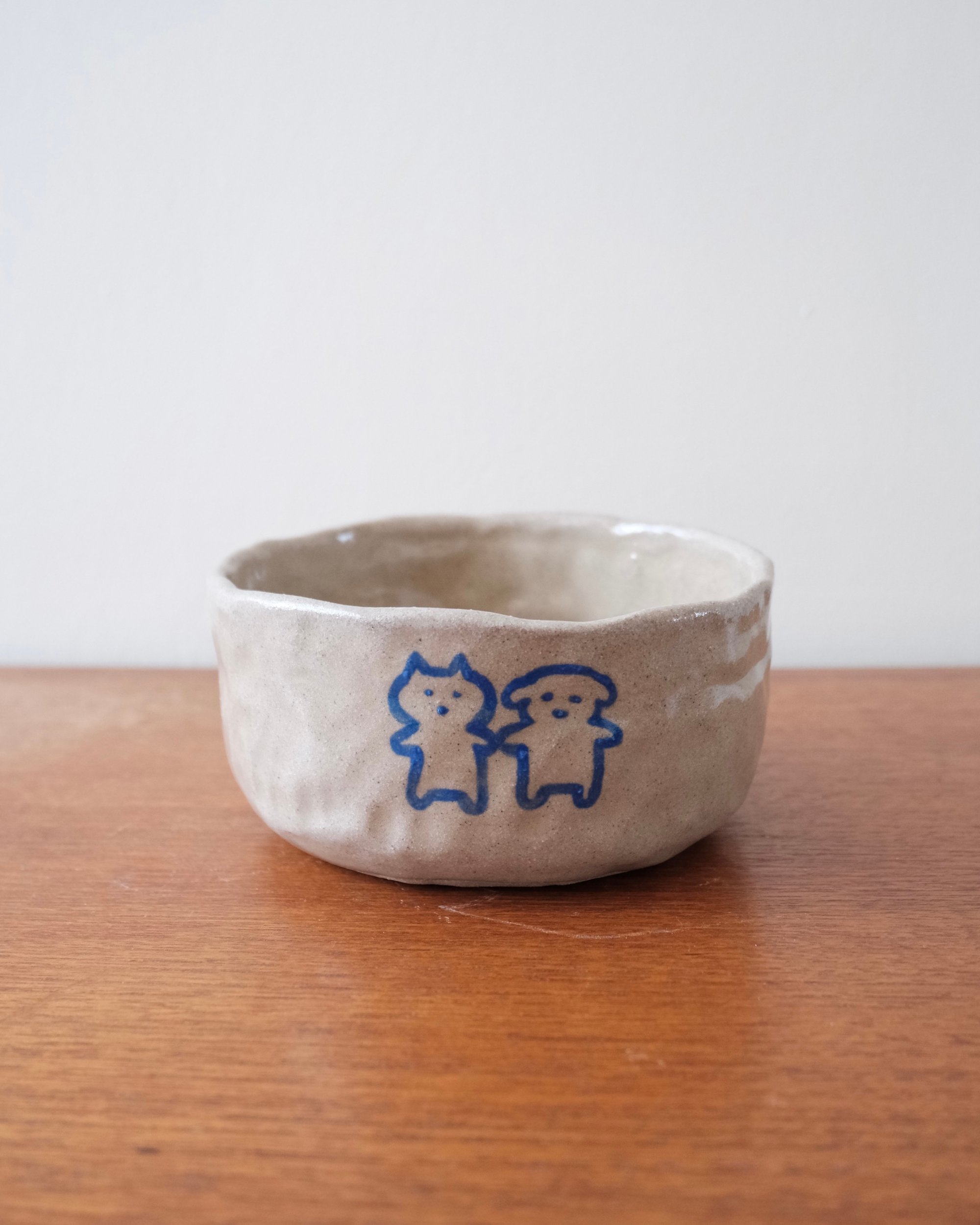 This bowl is crafted from stoneware clay and finished with a lead-free transparent glaze. Decorated with blue underglaze and fired at high temperatures, each piece is individually hand-built. On the front, a dog and a cat are holding hands. On the back, there’s a smiling flower.