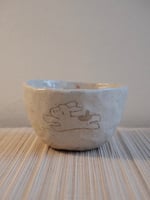 ‘Butterfly, man, apple, and dog’ The bowl is made of stoneware clay and fired twice at a high temperature. It is decorated with a food-safe underglaze pencil. The design is inspired by simple Asian retro ceramic dinnerware. Kitsch and childlike, yet unique — a one-and-only design.