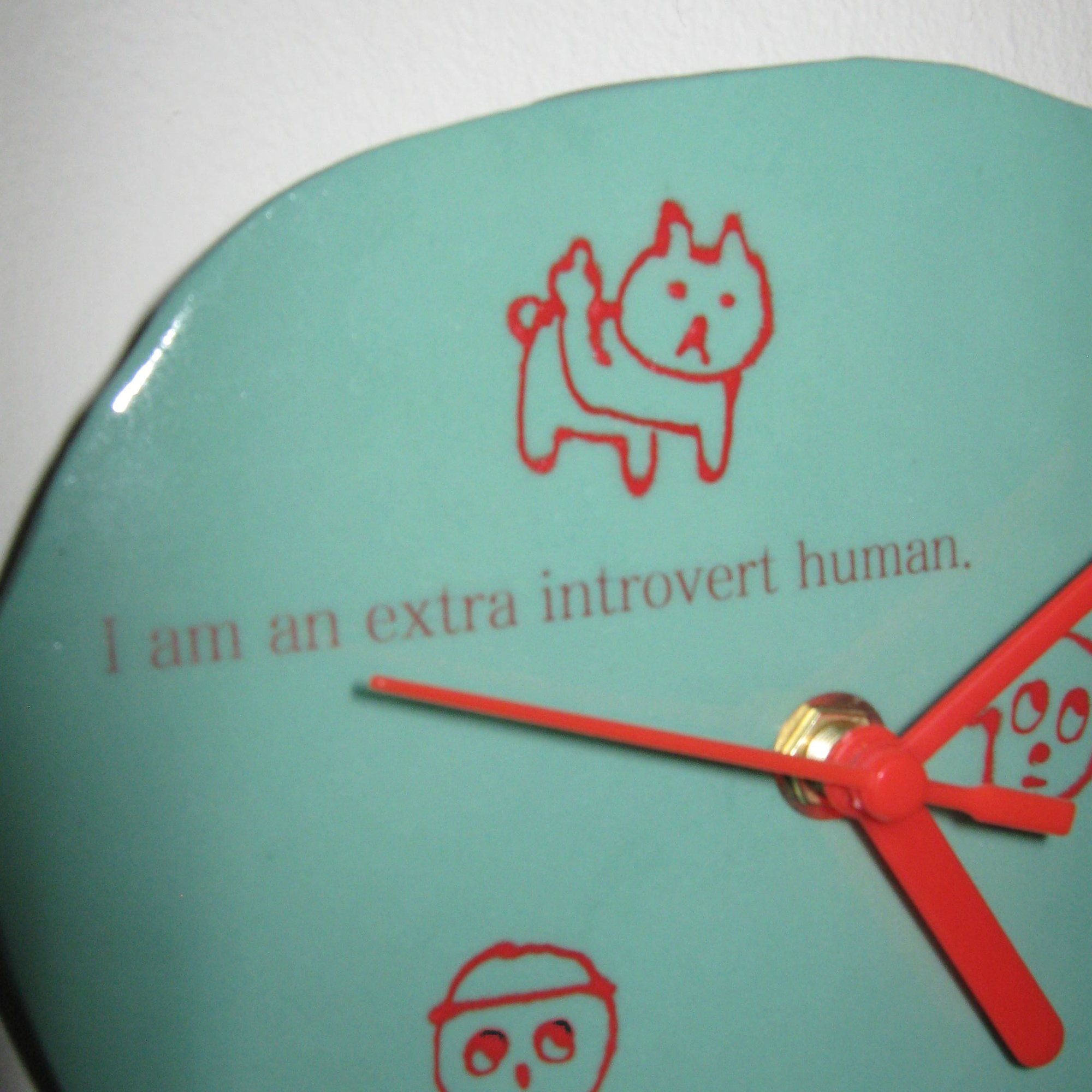 The 'Clock for an Introvert Human' is crafted from green-colored semi-porcelain and features a combination of hand drawings and digital decal writing. This product was fired on three times.