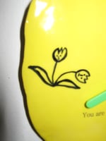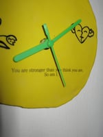 The 'Clock for strong people' is crafted from yellow-colored semi-porcelain and features a combination of hand drawings and digital decal writing. This product was fired on three times.