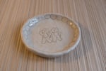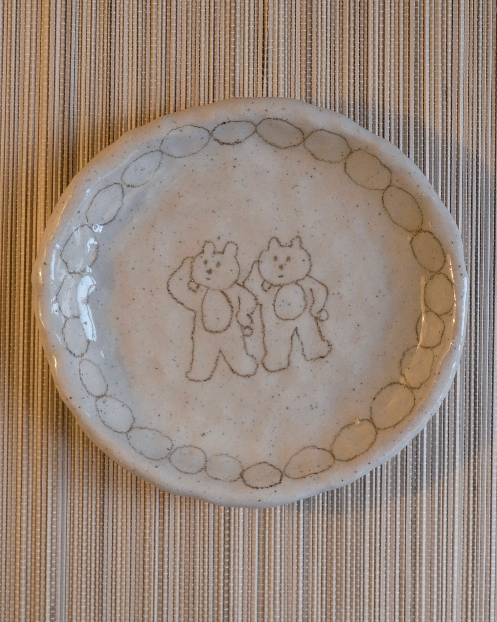 “Dancing Teddy bears.” The plate is made of stoneware clay and fired twice at a high temperature. It is decorated with a food-safe underglaze pencil. The design is inspired by simple Asian retro ceramic dinnerware.