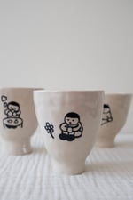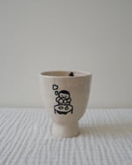 This cup is made of stoneware clay with a lead-free transparent glaze. It is decorated with underglaze and fired at a high temperature. Each piece is individually crafted using hand-building techniques. Use this cup when you need time for yourself — when you need a moment to think of nothing at all.
