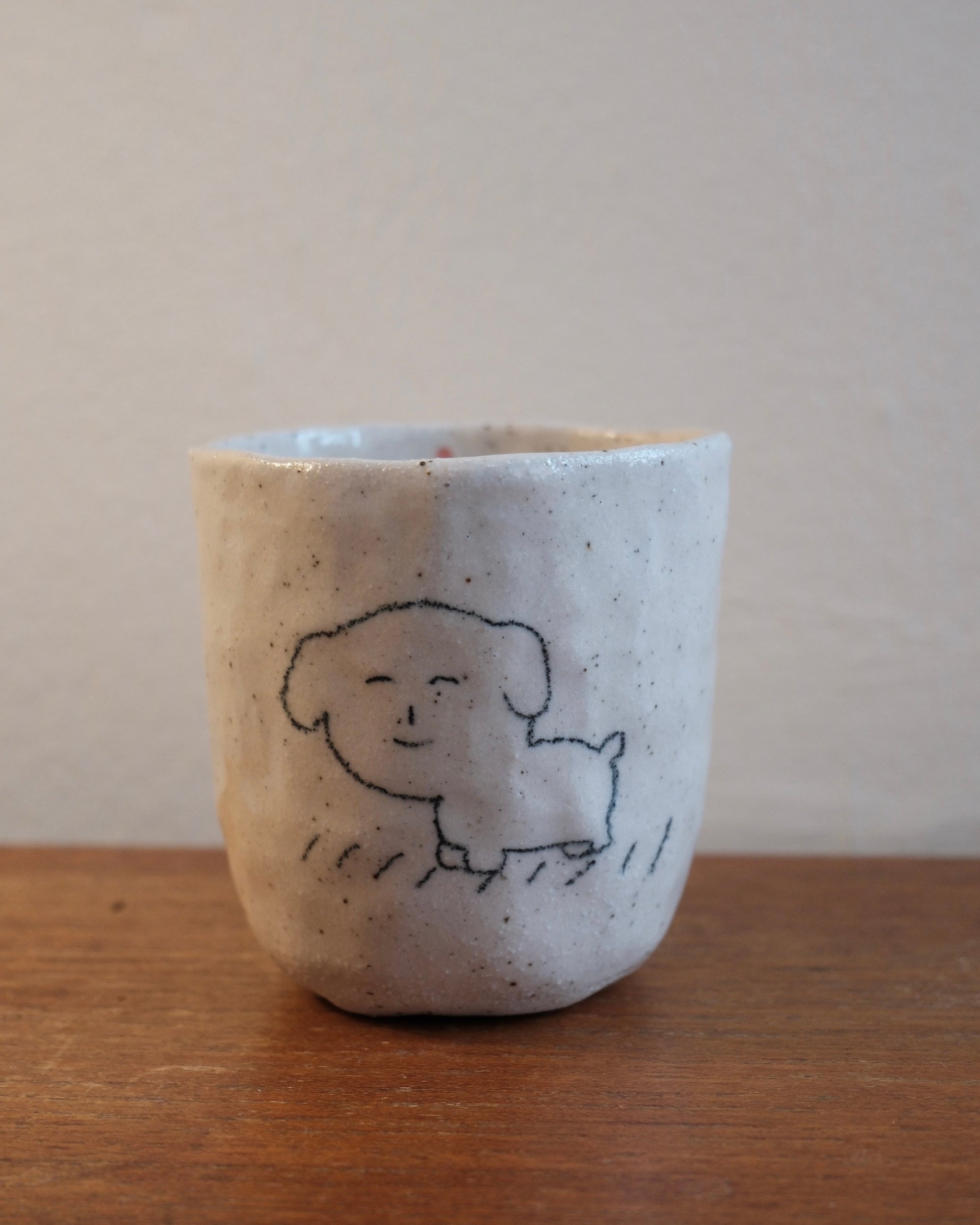 Happy Doggie Cup is made of stoneware clay and fired twice at a high temperature. It is decorated with a food-safe underglaze pencil. The design is inspired by simple Asian retro ceramic dinnerware. Kitsch and childlike, yet unique — a one-and-only design. Each piece is hand-built individually. The dog on the cup, with its awkward yet gentle smile, will somehow make you feel calm and at peace.