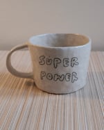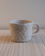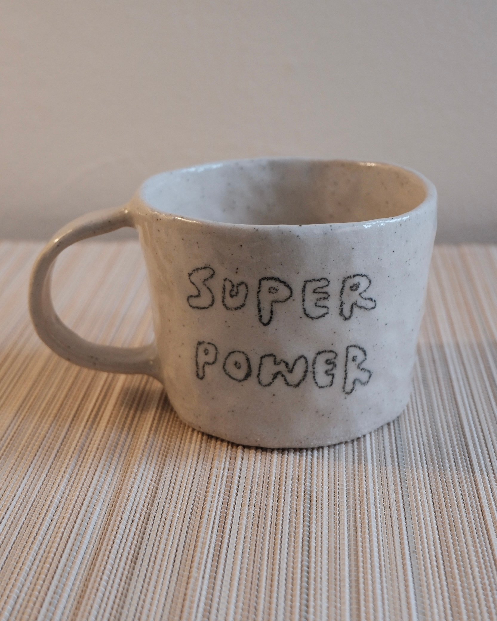 ‘Super power bear’ The cup is made of stoneware clay and fired twice at a high temperature. It is decorated with a food-safe underglaze pencil. The design is inspired by simple Asian retro ceramic dinnerware. Kitsch and childlike, yet unique — a one-and-only design.