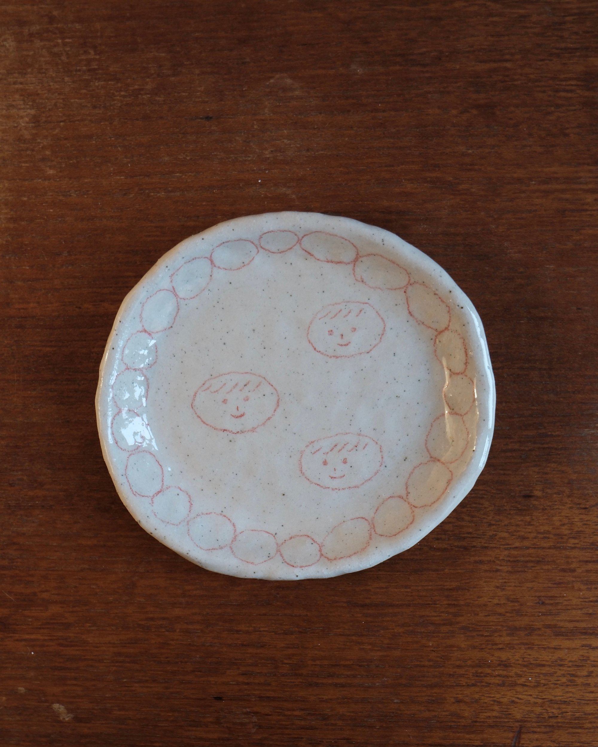 “Three smiling boys.” The plate is made of stoneware clay and fired twice at a high temperature. It is decorated with a food-safe underglaze pencil. The design is inspired by simple Asian retro ceramic dinnerware.