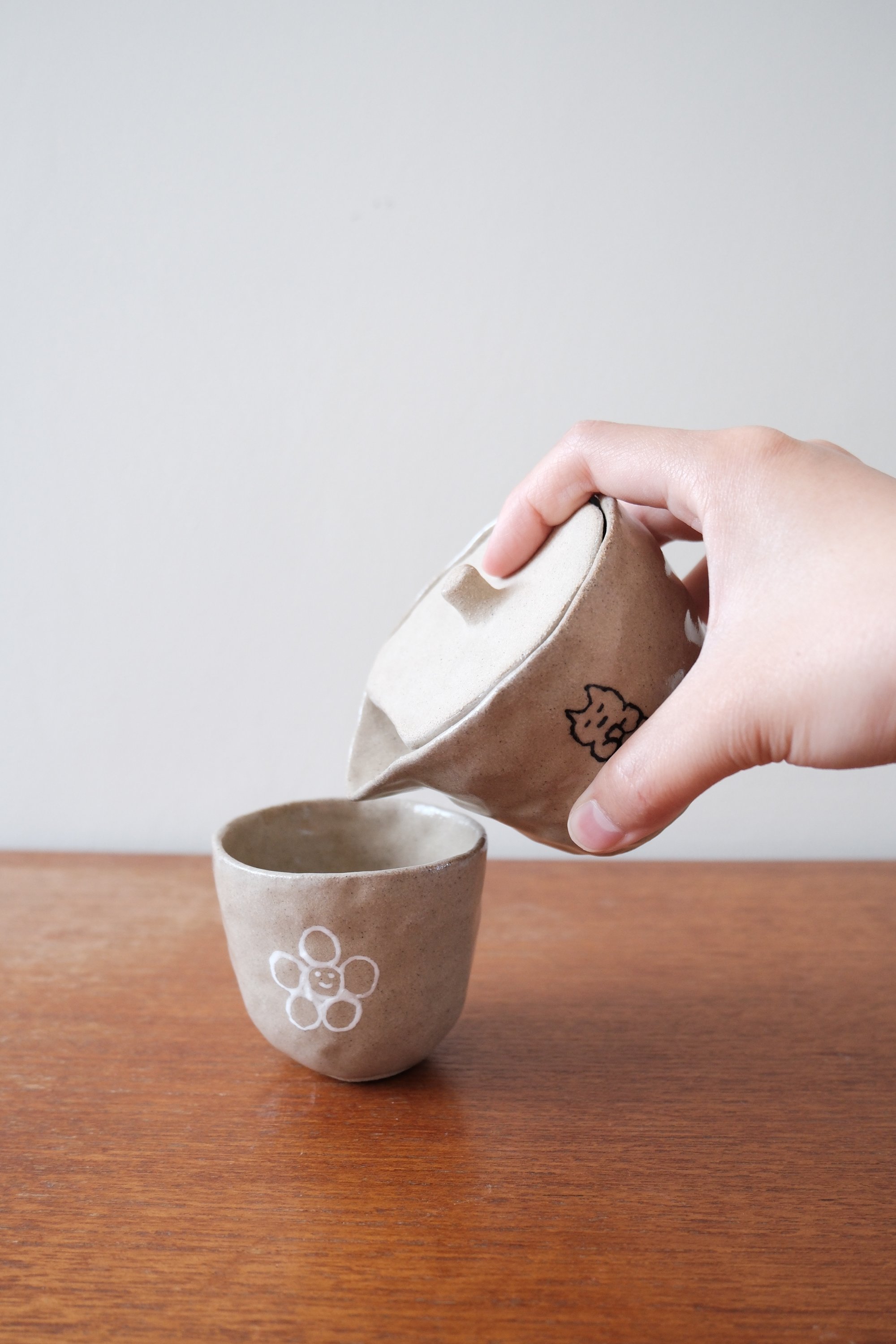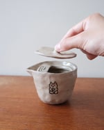 This small travel teapot is made of stoneware clay with a lead-free transparent glaze. It is decorated with underglaze and fired at a high temperature. On the front, there is a meditating cat figure, and on the back, a smiling flower figure — the signature shape of ‘Coolest Slug’.