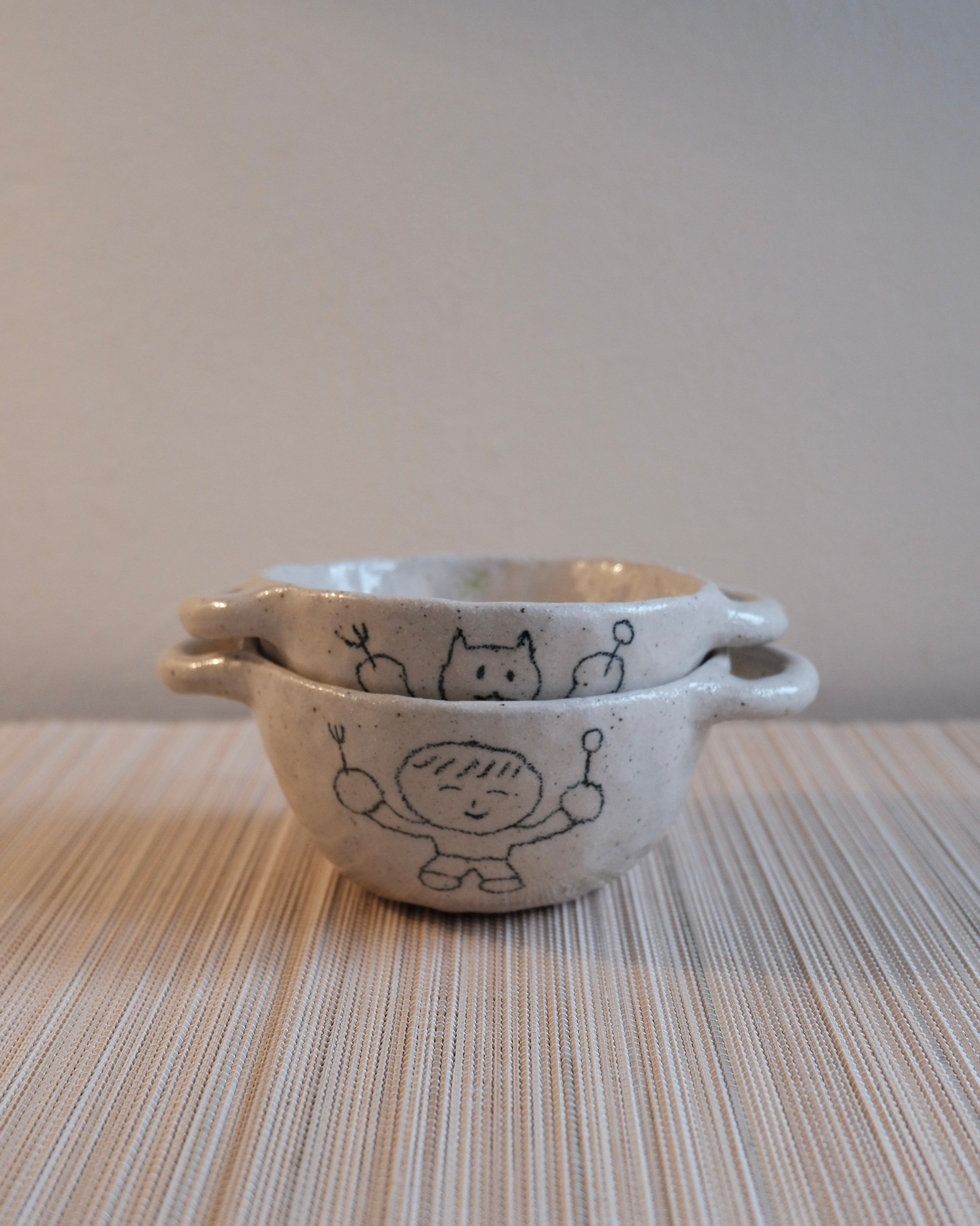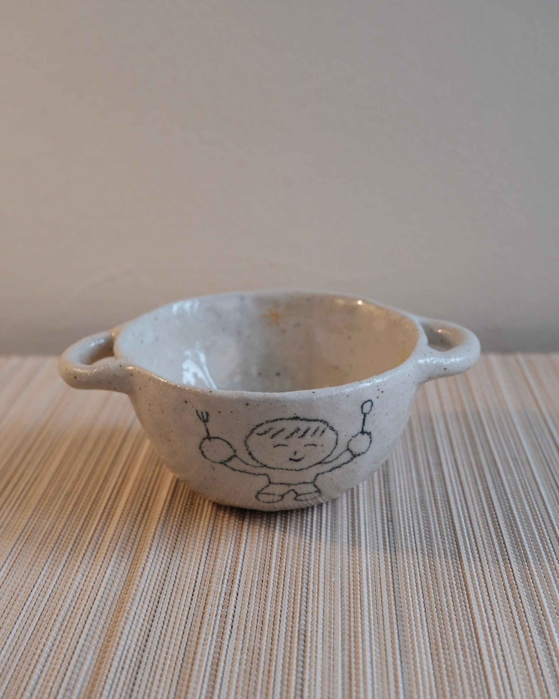 ‘Boy holding spoon and fork’ bowl with handle bowl is made of stoneware clay and fired twice at a high temperature. It is decorated with a food-safe underglaze pencil. The design is inspired by simple Asian retro ceramic dinnerware. Kitsch and childlike, yet unique — a one-and-only design.